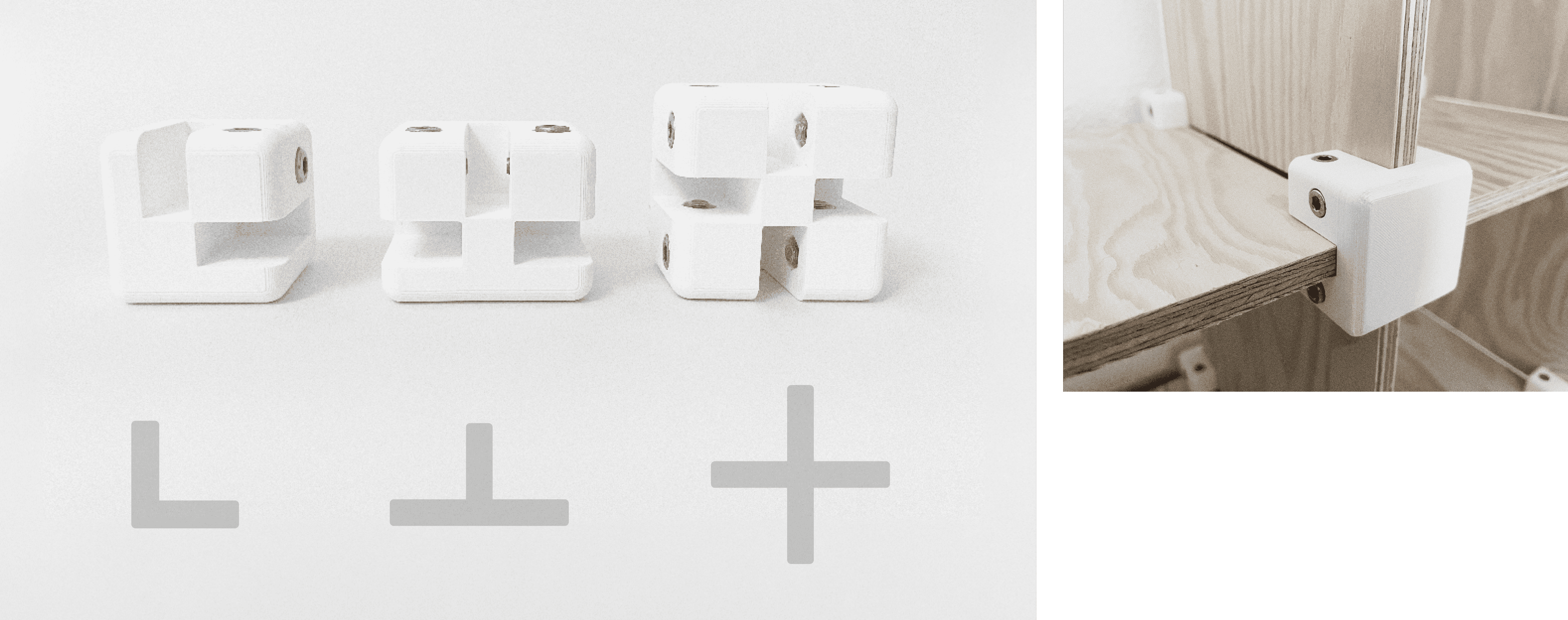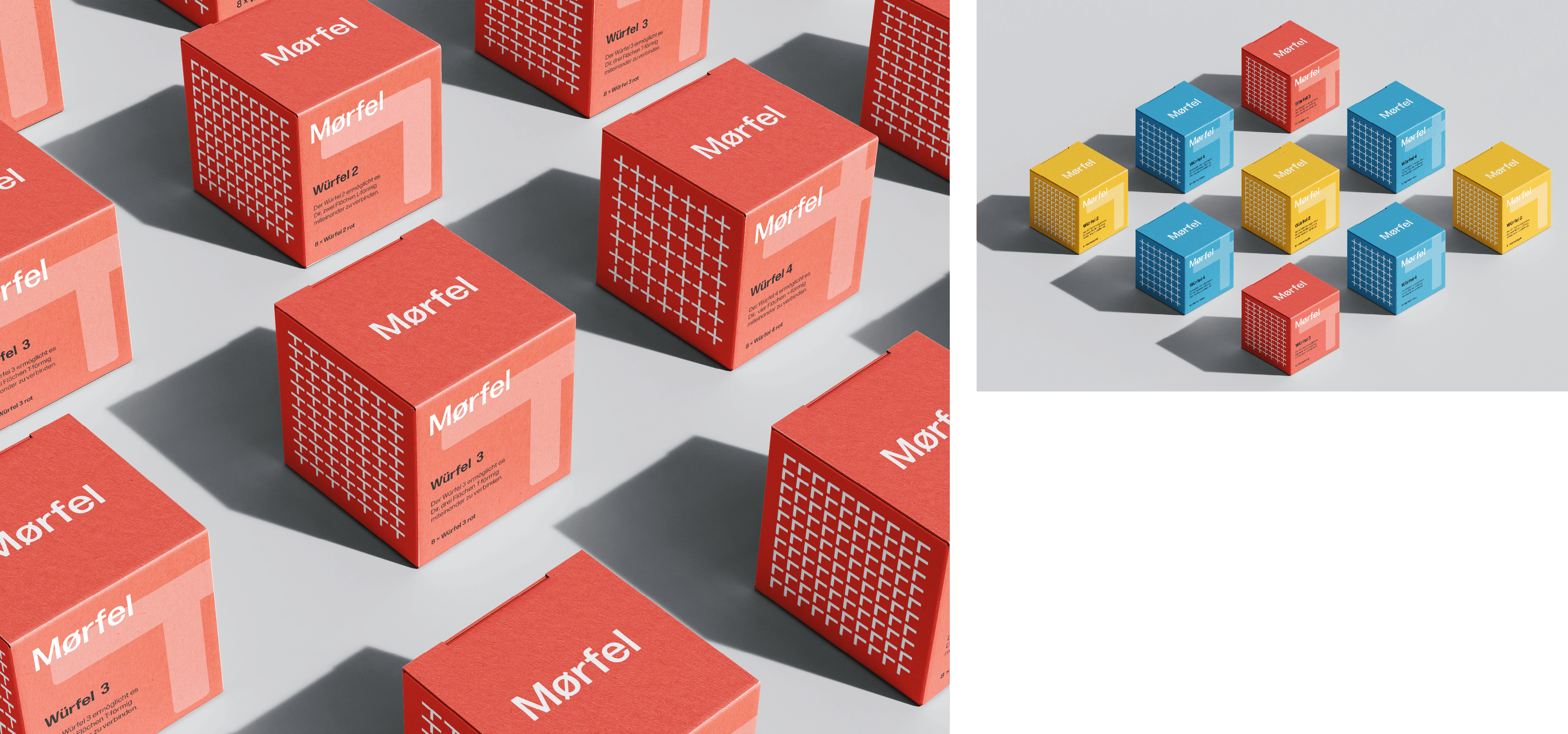 Mit den drei Mørfel-Würfeln lassen sich zwei Flächen L-förmig, drei Flächen T-förmig und vier Flächen Plus-förmig reversibel verbinden. Die Würfel können beliebig kombiniert und gedreht werden, sodass ganz verschiedene Möbeldesigns erstellt werden können.