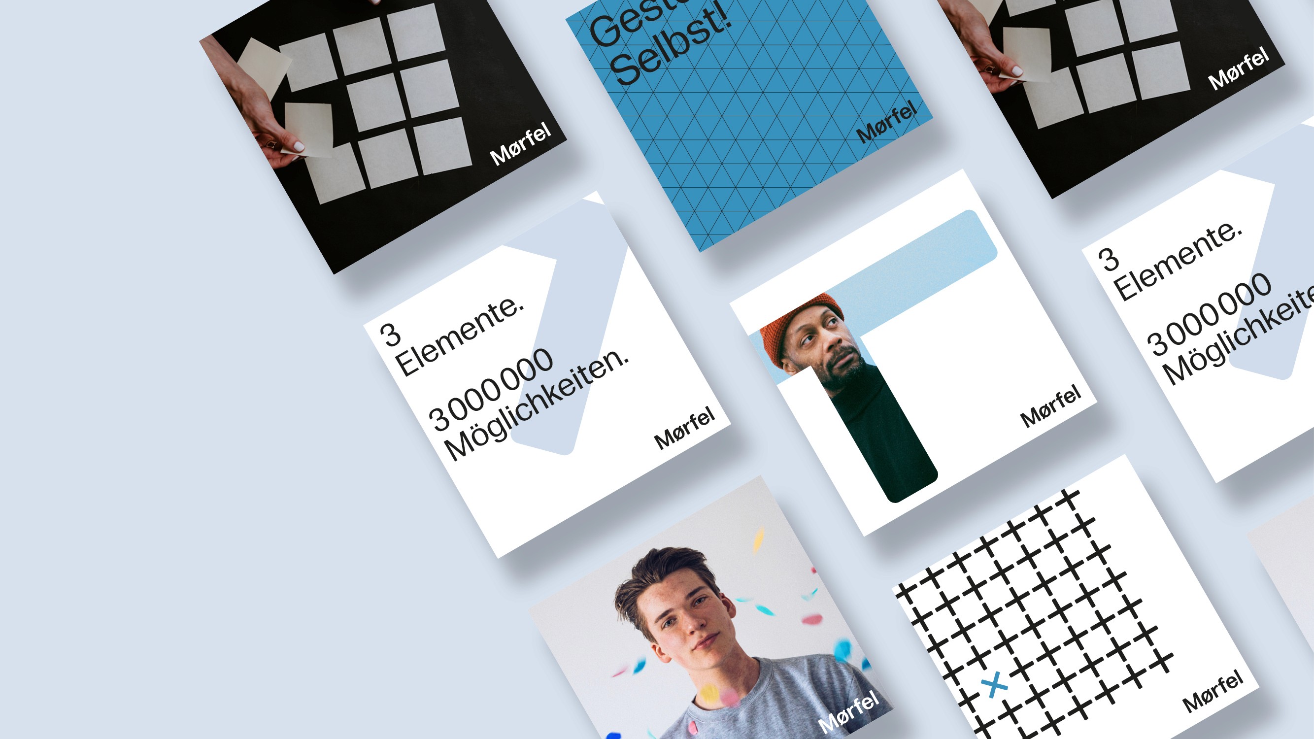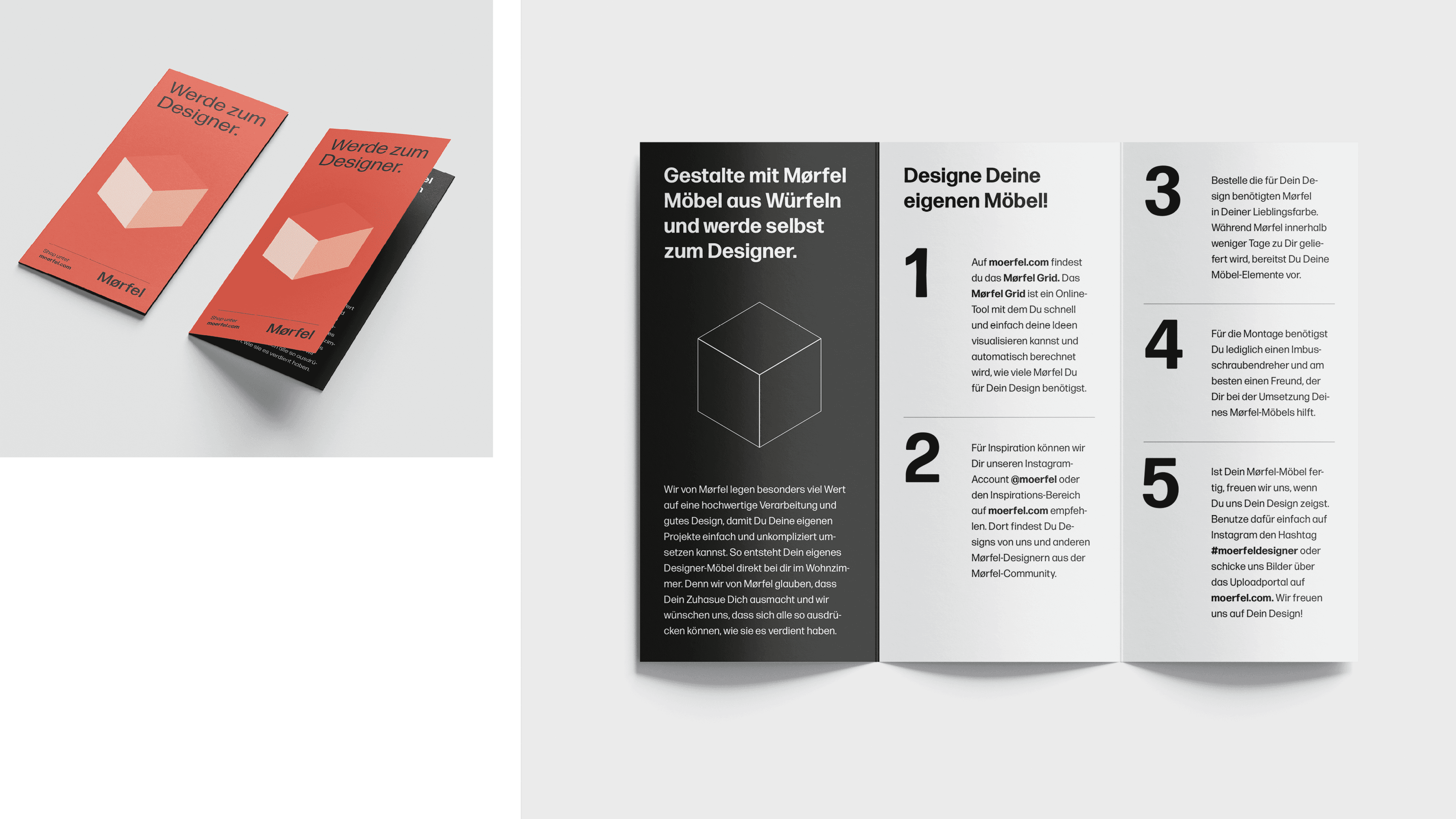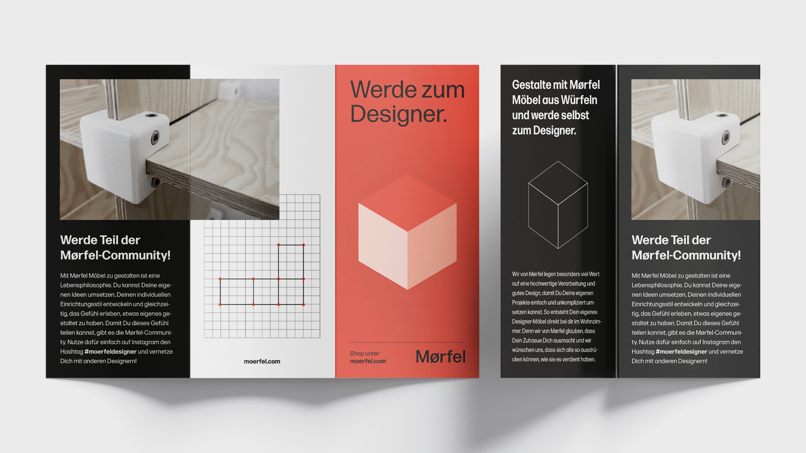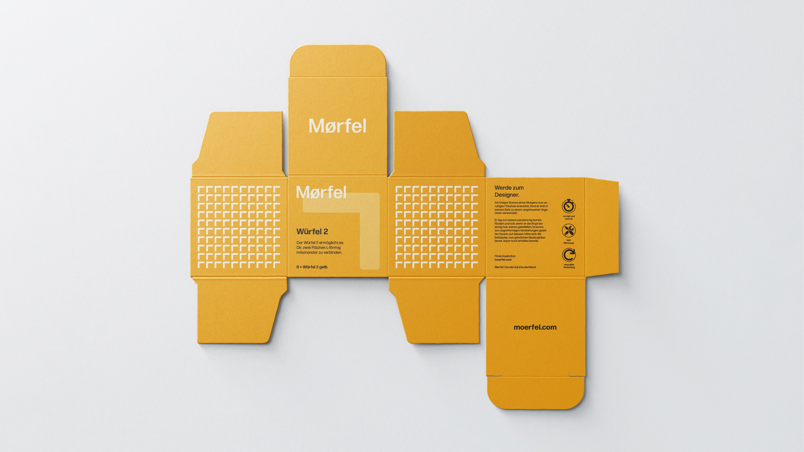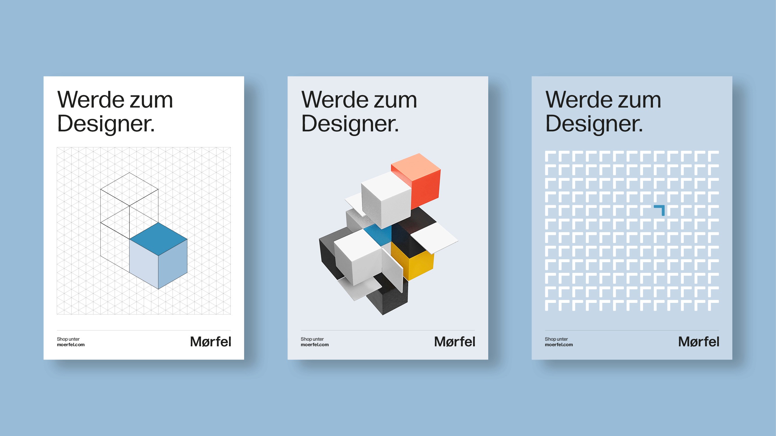 Das Aussehen von Mørfel ist bestimmt durch seine Funktion, ganz im Sinne des Bauhaus. Auch das Corporate Design lehnt sich an die Prinzipien und Ästhetik des Bauhaus an. Darüber hinaus greift das Corporate Design die form- und funktionsgebenden Merkmale von Mørfel auf – und aus Mørfels Markenkern und Vision machte ich den Marken-Claim: Werde zum Designer.