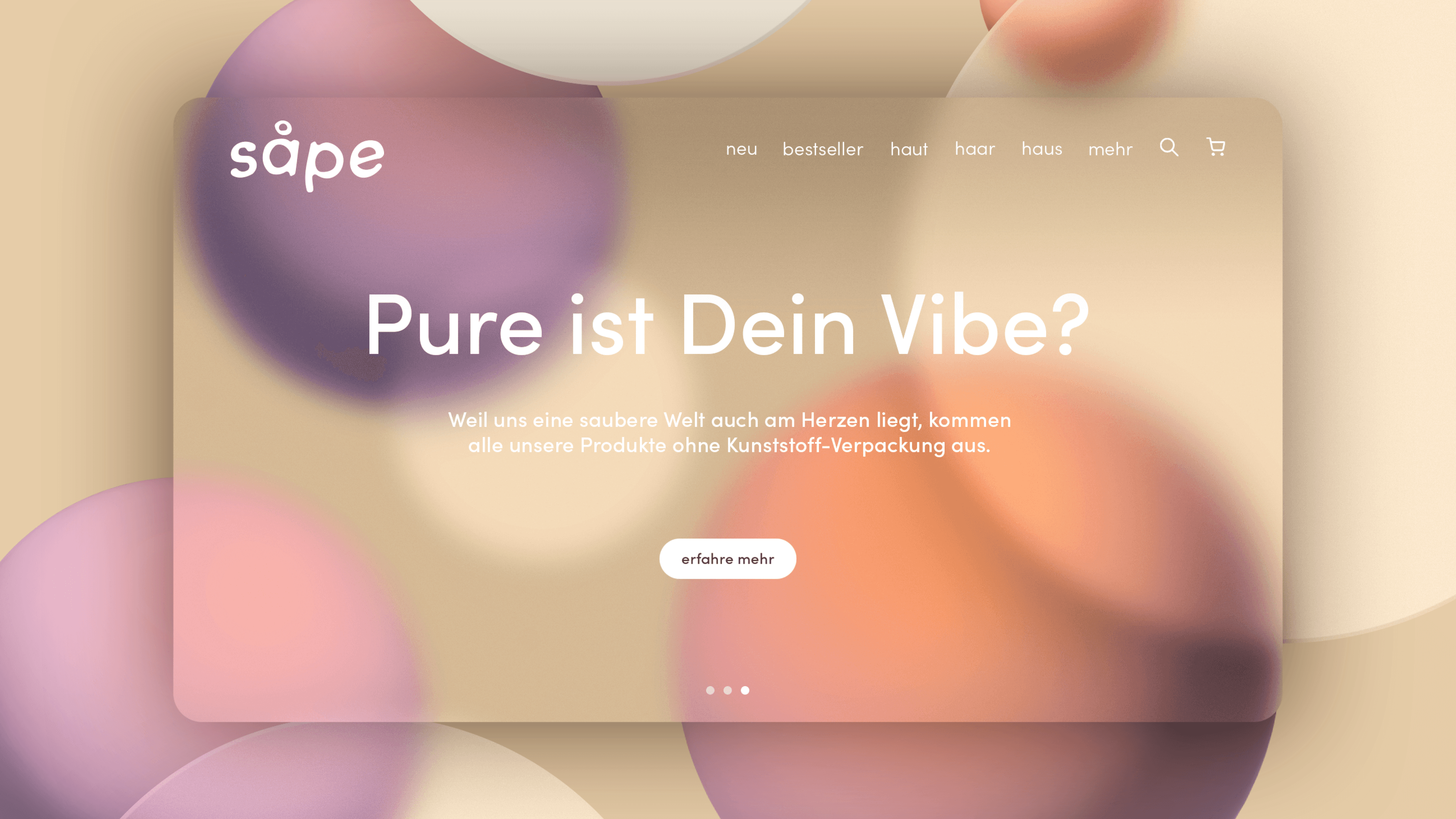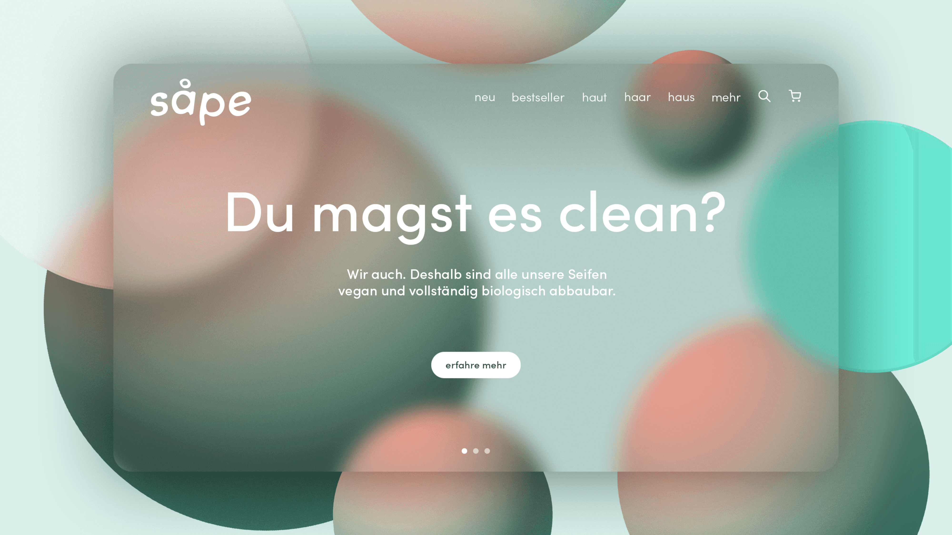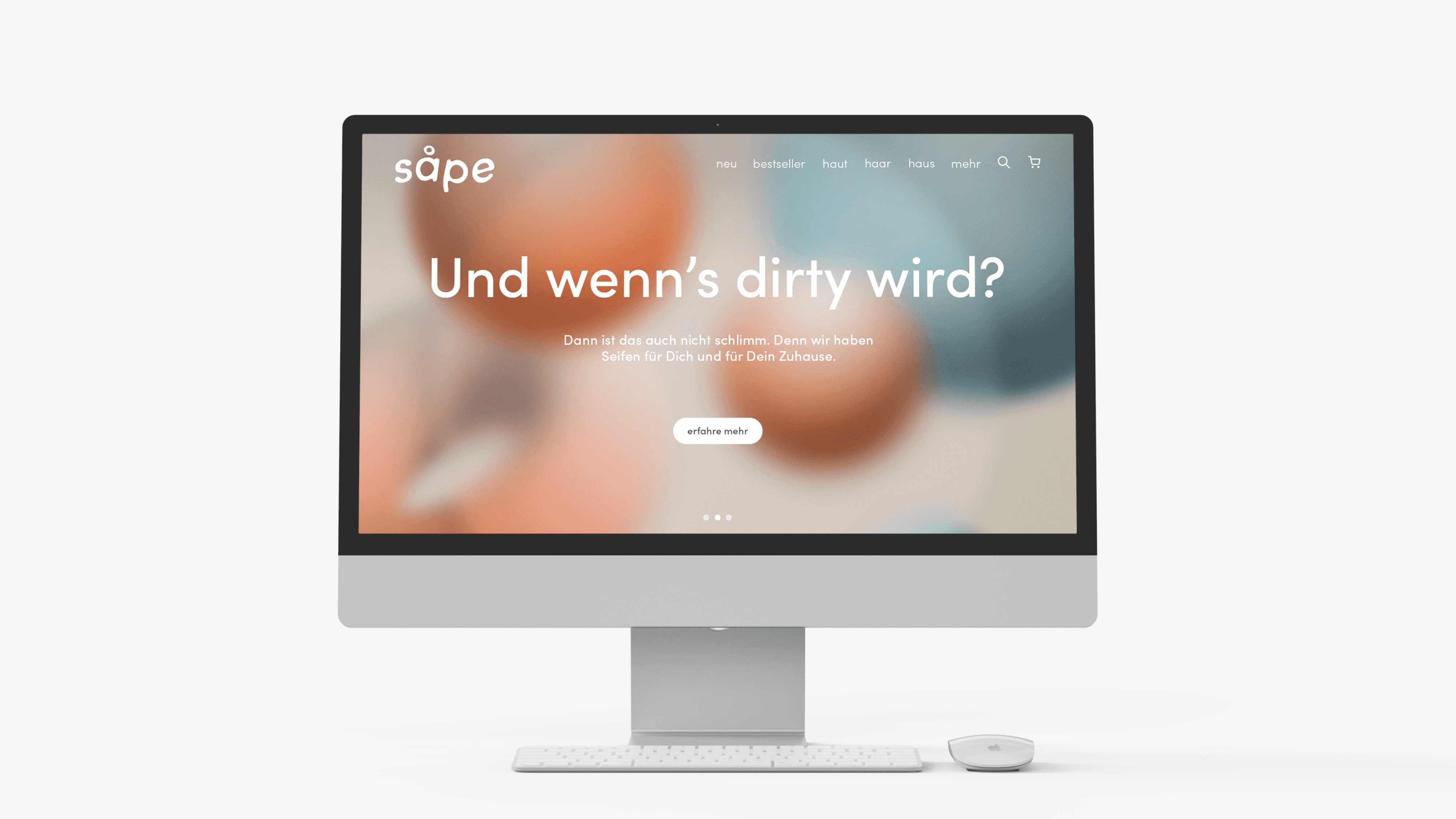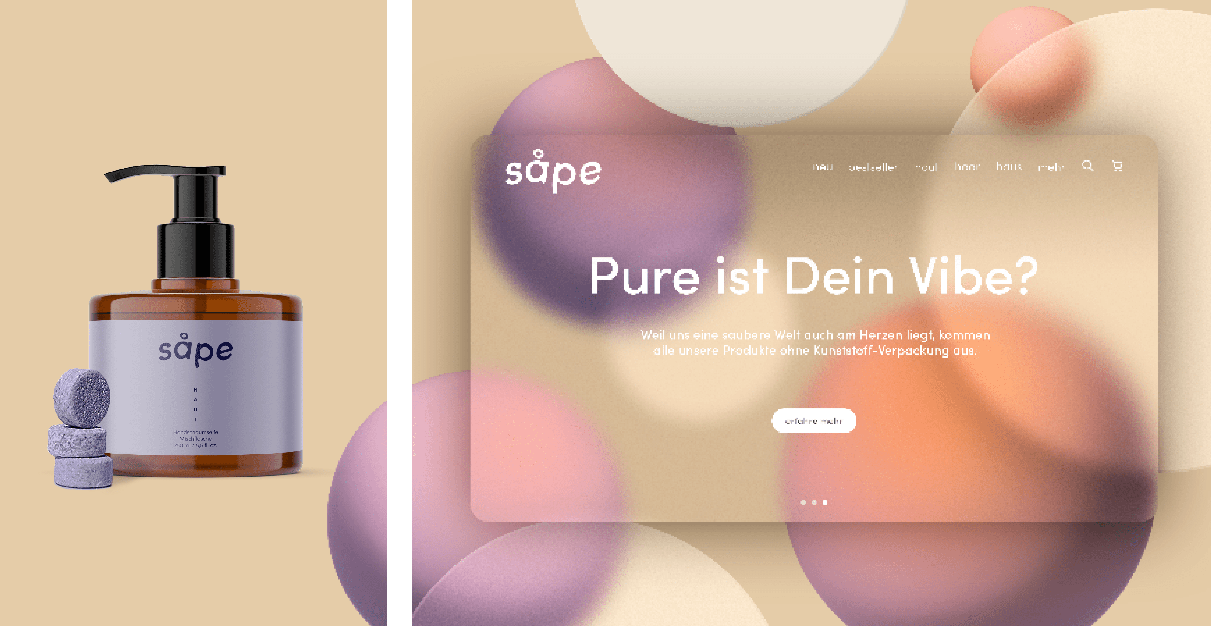 So entstand die Idee für såpe: ein fiktives Markenkonzept, das vegane und plastikfreie Seifen für Haut, Haare und Haushalt herstellt, um Wohlbefinden und Nachhaltigkeit zu einem ganz natürlichen Teil des Alltags zu machen. Angelehnt an die Keyvisuals entwickelte ich das Verpackungsdesign und erste Homepage-Ansätze.