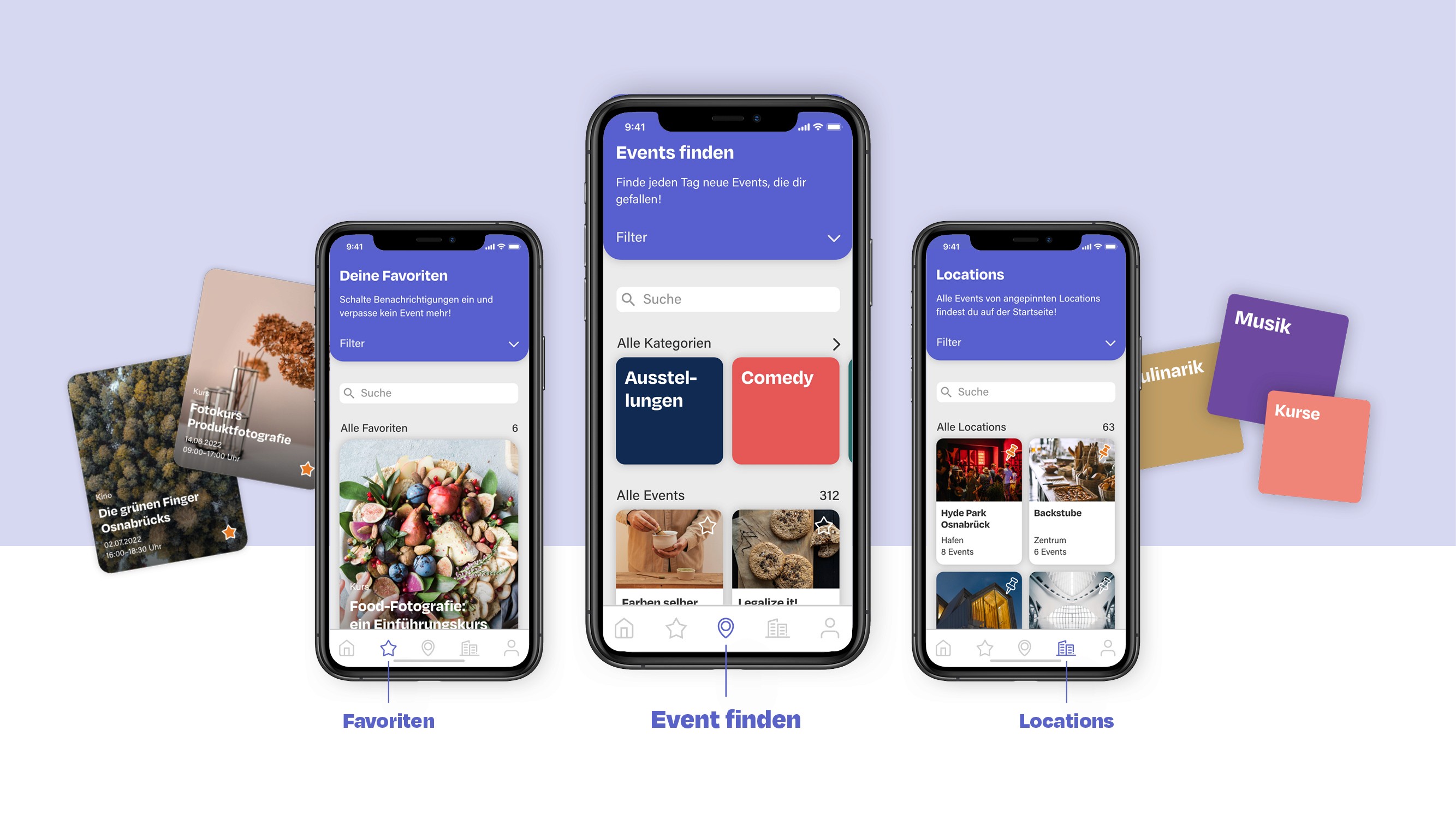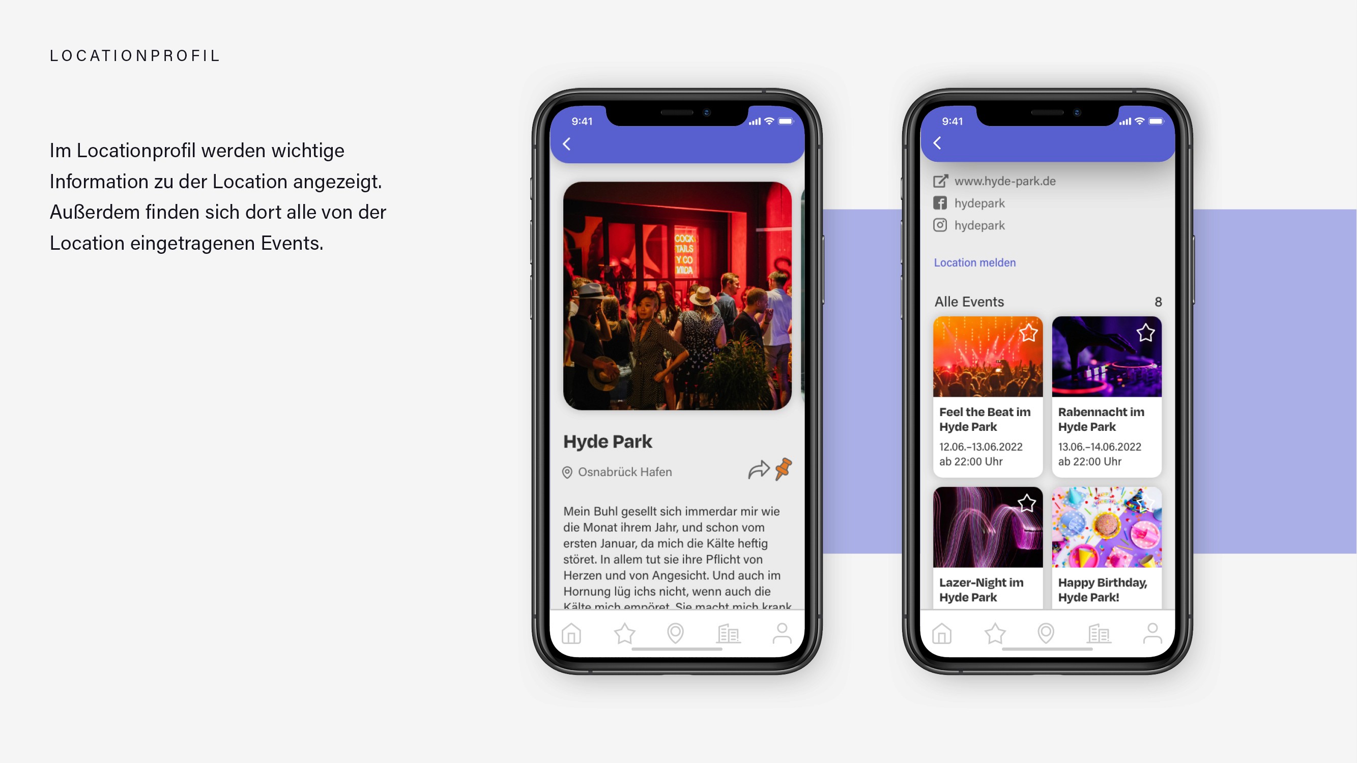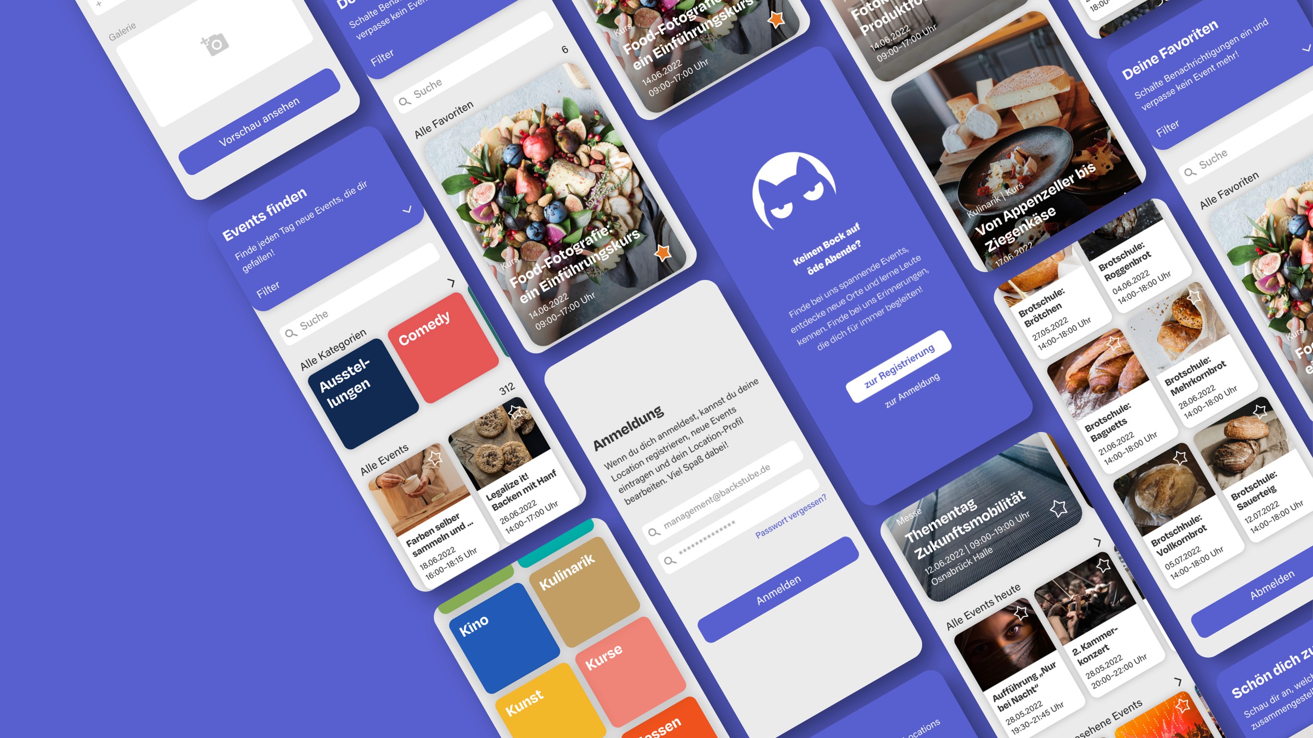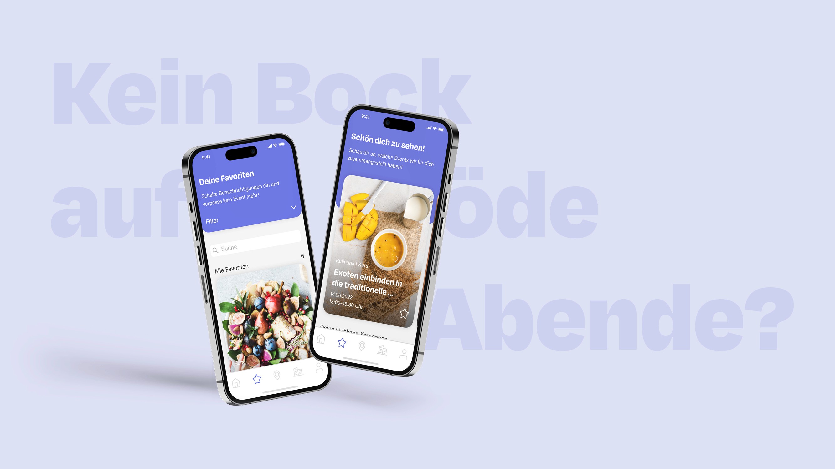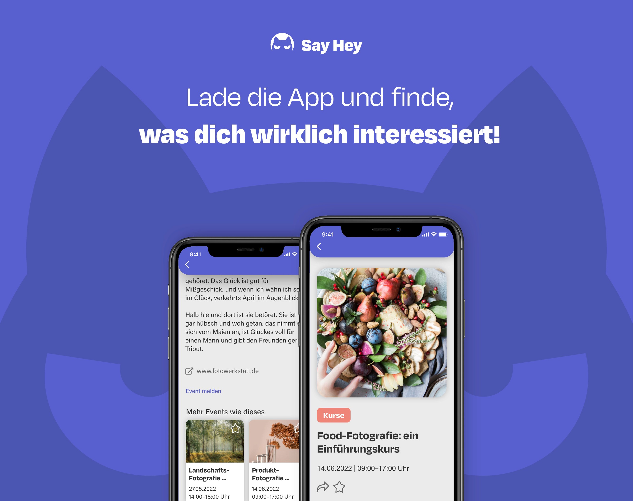 SayHey ist ein fiktives App-Konzept, das alle Events einer Region bündelt und eine einfache Schnittstelle zwischen Event(be)sucher:innen und Eventveranstalter:innen bietet. Dafür entwickelte ich sowohl die visuelle Identität als auch die App-Gestaltung. Die App zielt darauf ab, junge, digitalaffine Menschen zu erreichen, die sozial- und erlebnisorientiert sind sowie Orte zum Austausch und Zusammentreffen suchen; die App soll als soziales Werkzeug dienen. Der Name SayHey deutet dies bereits an und spiegelt die zugrunde liegende Idee wider. Gleichzeitig soll die App Eventveranstalter:innen eine Plattform bieten, um ihre Veranstaltungen zu präsentieren. Die Bildmarke ist eine vereinfachte „Grumpy-Cat“ und steht auf humorvolle Weise im Gegensatz zum Markenname „Say Hey“.
